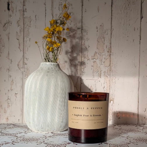 Light and graceful, this fragrance captures the feeling of crisp orchard air and freshly cut blooms. Ripe pear drifts through the brightness of white freesia, softened by gentle hints of amber and patchouli. Hand-poured in natural soy wax and finished with a pure cotton wick, this 260g candle offers around 50 hours of clean, even burn — creating a warm glow that turns any moment into something quietly indulgent.